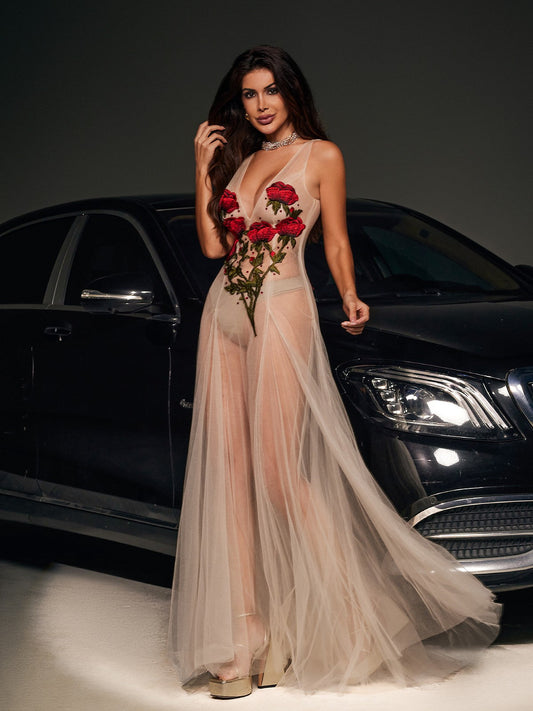 Abito in Rete Ricamato a Fiori Kateri con Scollatura a V