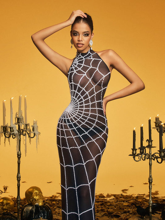Abito Maxi Bianco Kaelyra con Collo Alto e Perle a Ragnatela