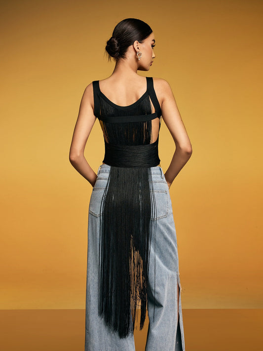 Body in Rete con Frange di Cristallo e Paillettes Corusc