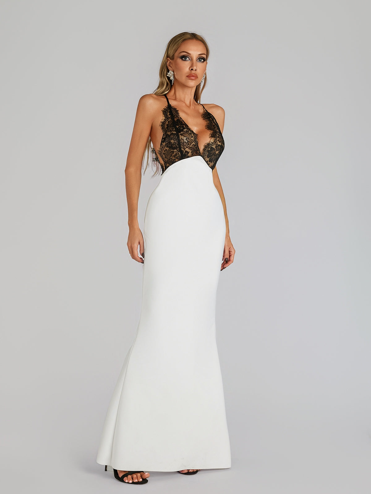 Abito Maxi in Pizzo con Scollo Halterneck Bianco