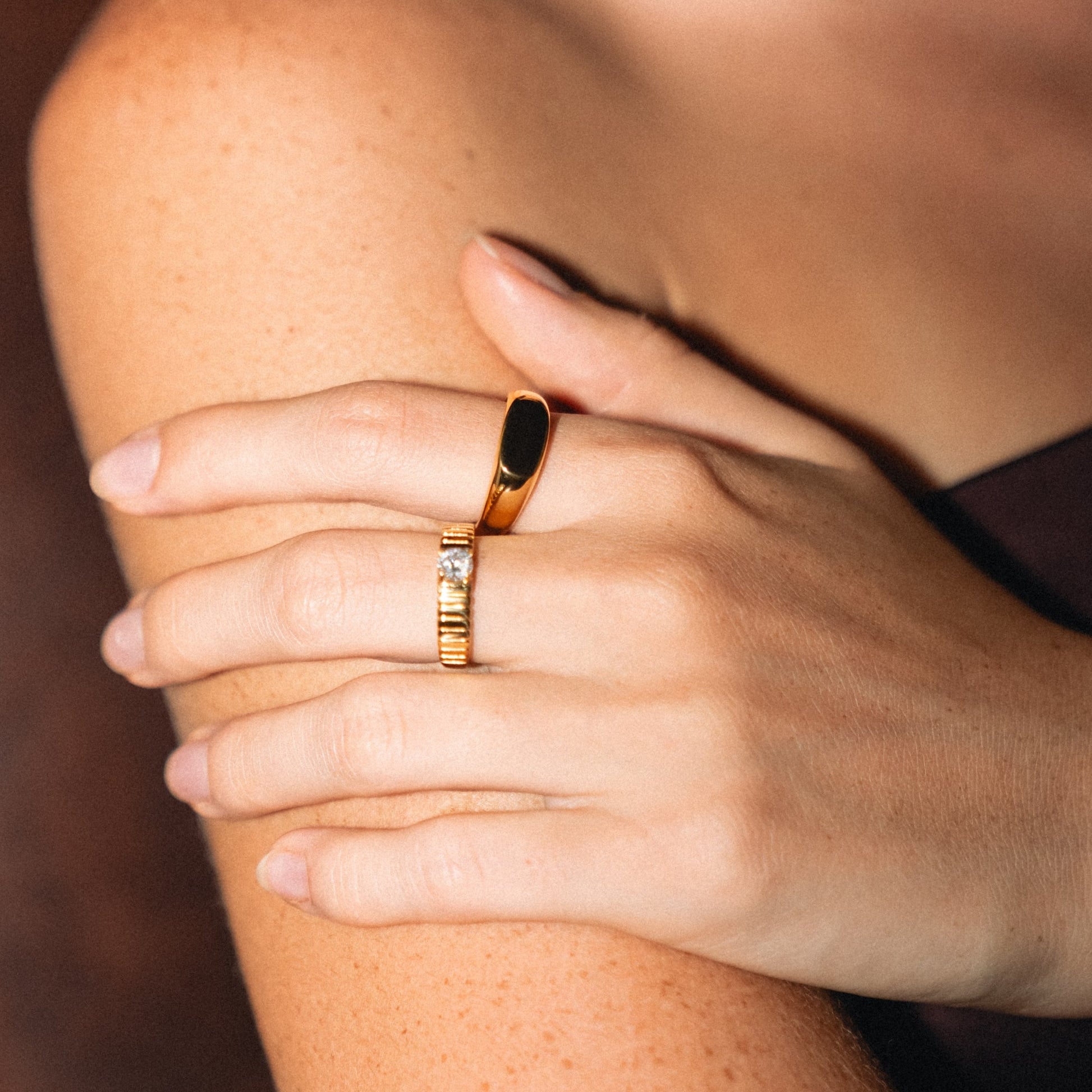 Linee pulite, forte presenza. L'Anello Dichiarazione Aspen è tutto incentrato sull'equilibrio, una bold band in oro ammorbidita da una singola pietra di zirconio luminescente di alta qualità. Senza sforzo, sicuro di sé e progettato per stare da solo.