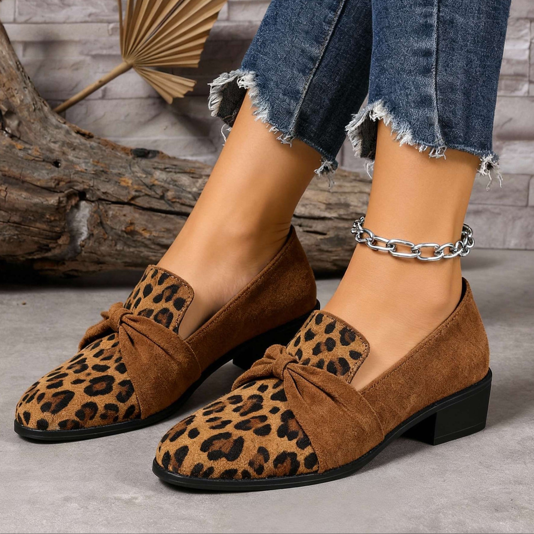 Soft leather lining envelops the foot in softness; these slip-ons offer cushioned comfort with a natural lift. The upper combines velvety suede with a leopard pattern and a soft, knotted bow over a sturdy heel. These textures form a loafer with tonal richness and vintage spirit.