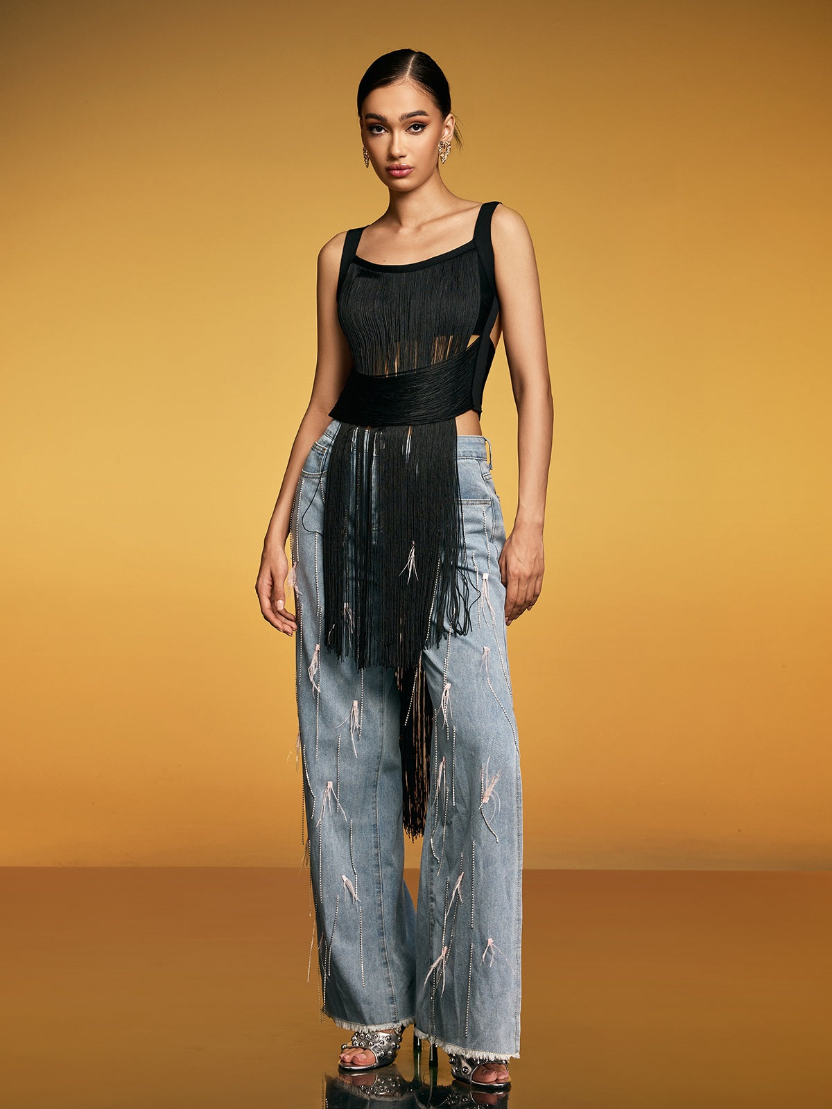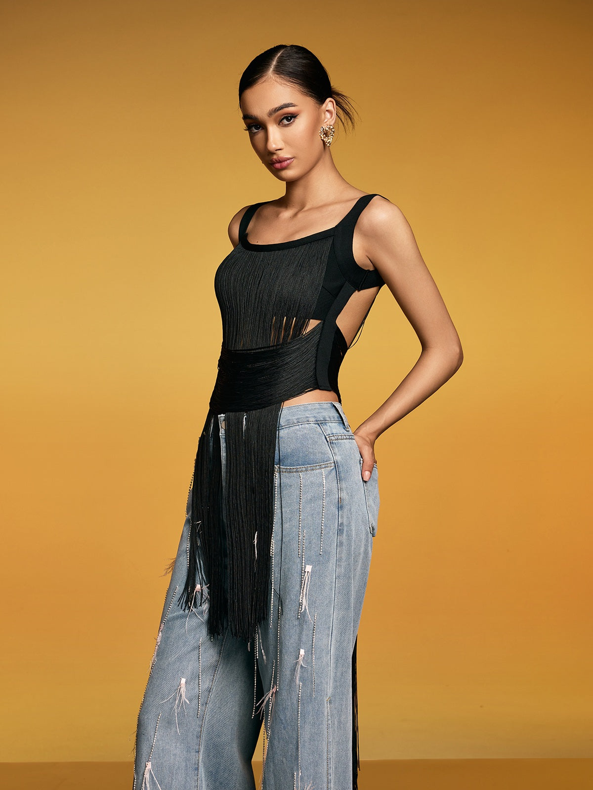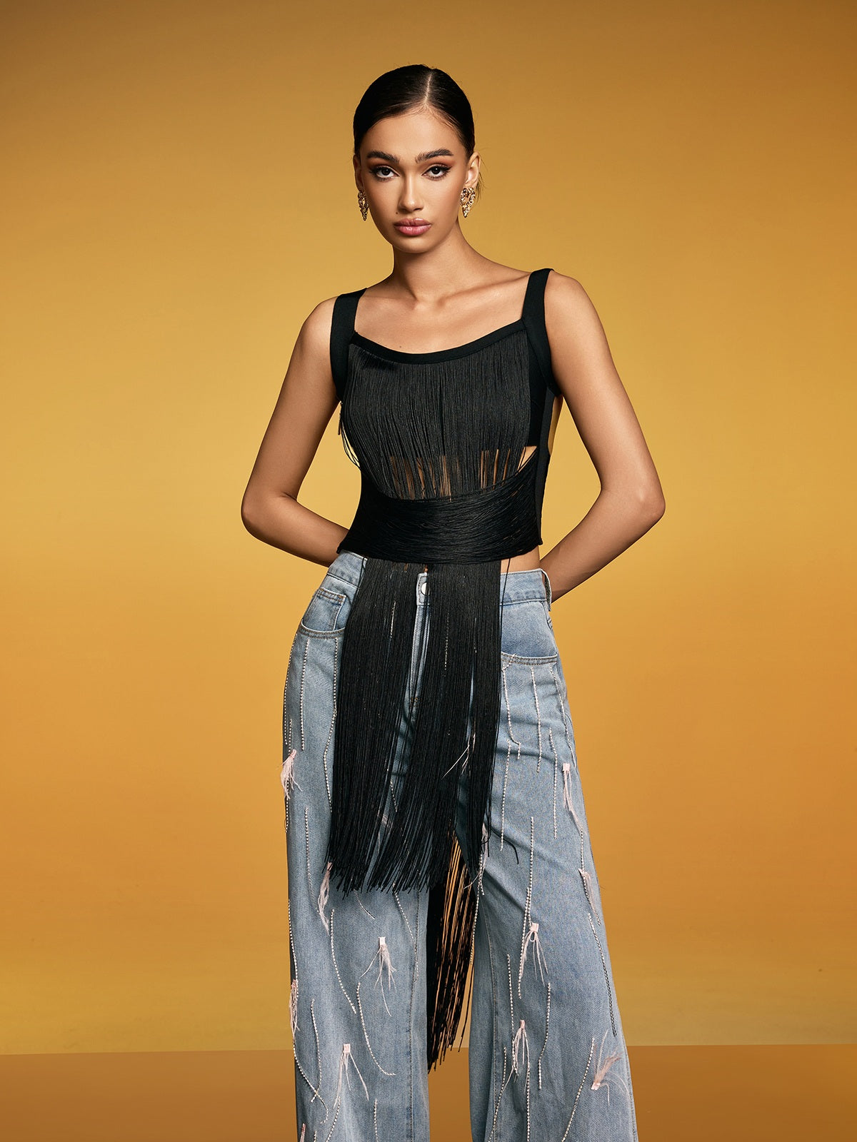 Eleva il tuo guardaroba con il Top Bandage con Frange Dualine, dove il design contemporaneo incontra un fascino indiscutibile. Questo pezzo straordinario presenta una costruzione a bandage elegante che abbraccia splendidamente le tue curve, mentre i dettagli delle frange giocose aggiungono movimento e personalità a ogni indossata. Perfetto per le serate fuori o per fare una dichiarazione audace, questo top combina una vestibilità che aumenta la fiducia con uno stile accattivante. Il design bicolore offre opzioni di abbinamento versatili con i tuoi pantaloni preferiti, rendendolo un'aggiunta essenziale a qualsiasi guardaroba alla moda. Fai girare le teste e sentiti favolosa in questo essenziale moderno.